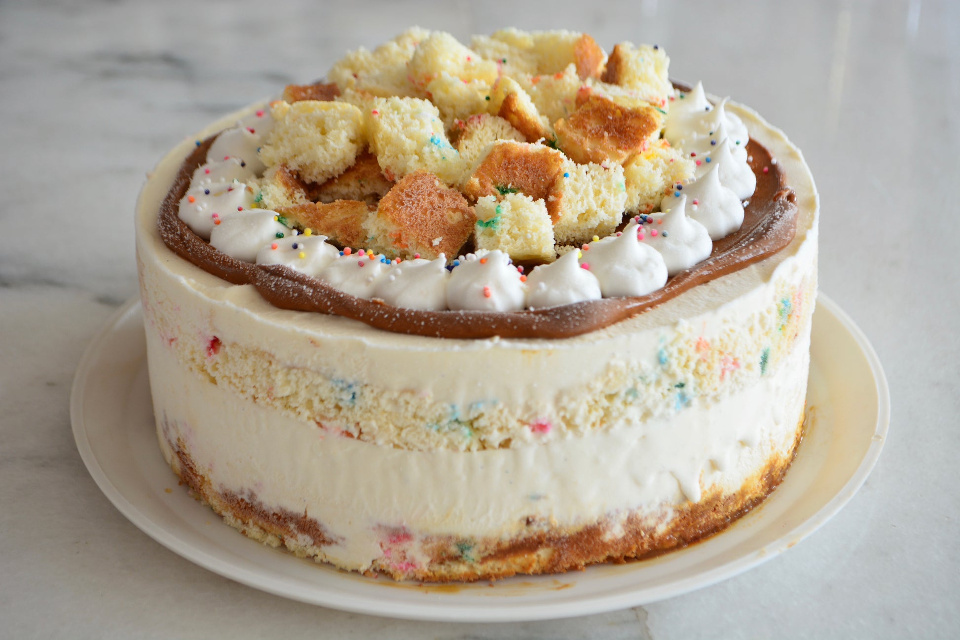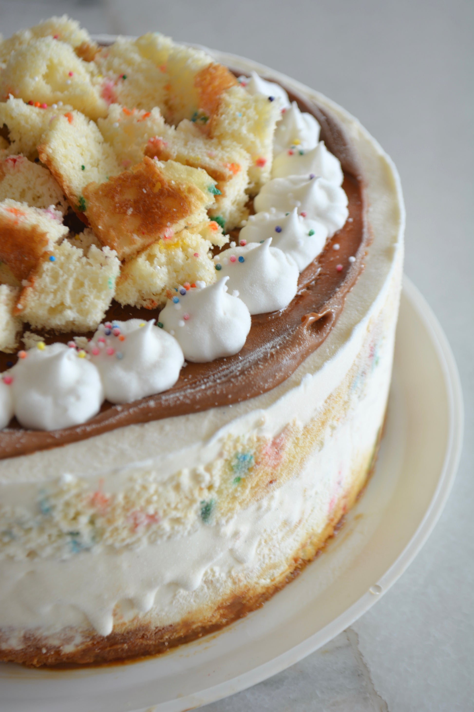 Este delicioso pastel es la opción perfecta para celebrar cualquier cumpleaños. Delicioso pastel con helado de vainilla, esponjoso pastel de vainilla y chispas de colores, relleno de dulce de leche.