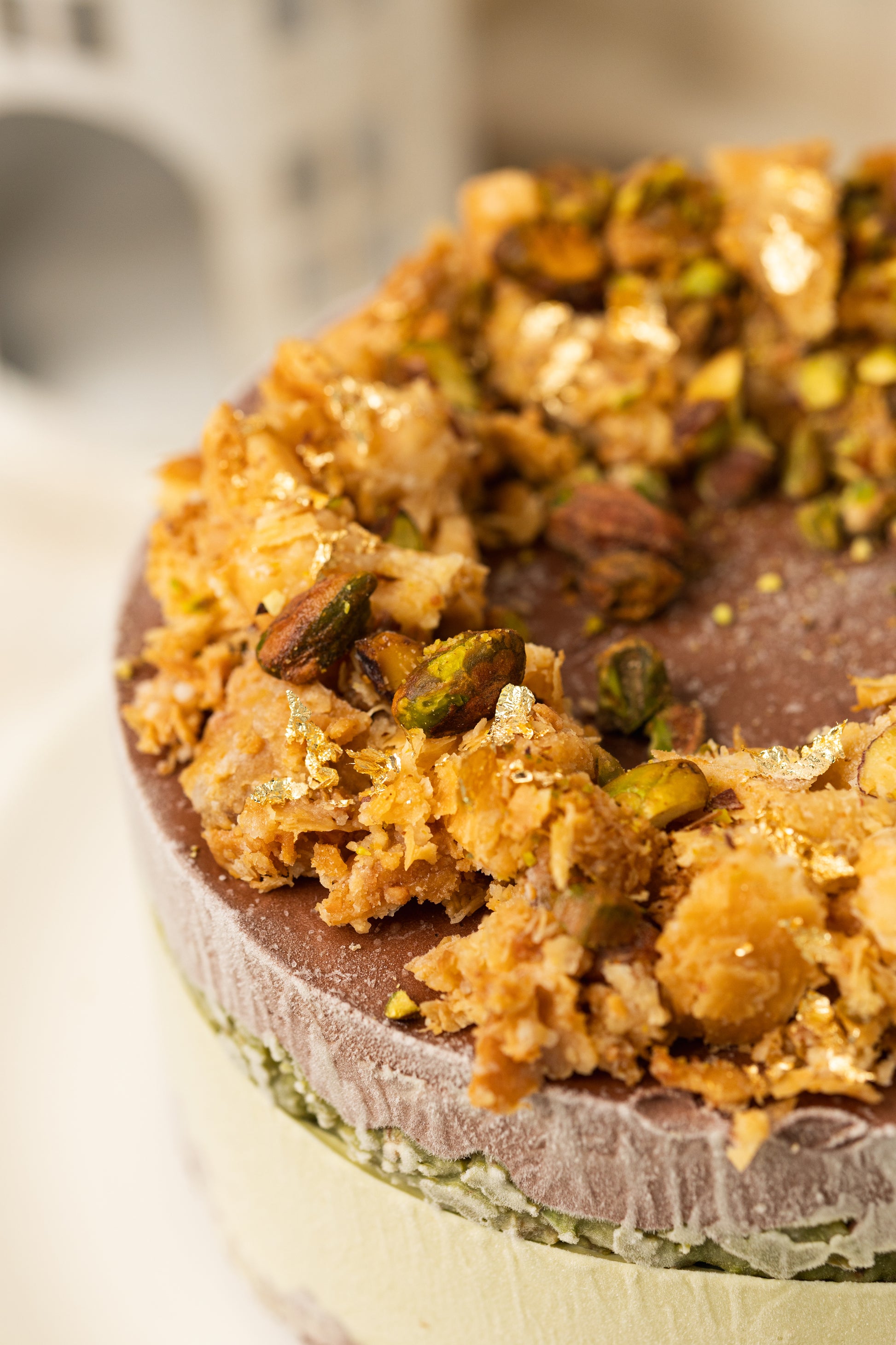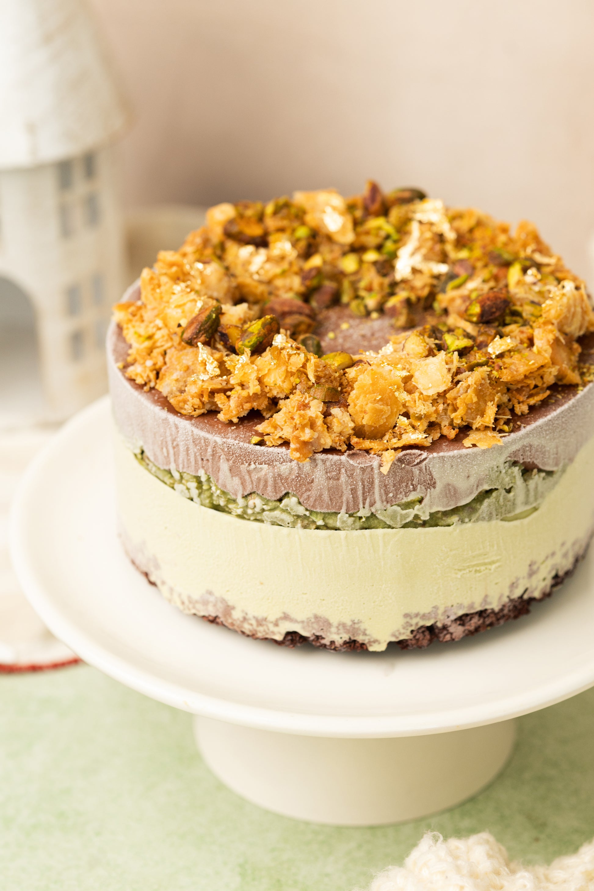 Delicioso pastel de chocolate con helado de chocolate y helado de pistache, coronado con dulces árabes, pasta de pistache y pistache en trozo.